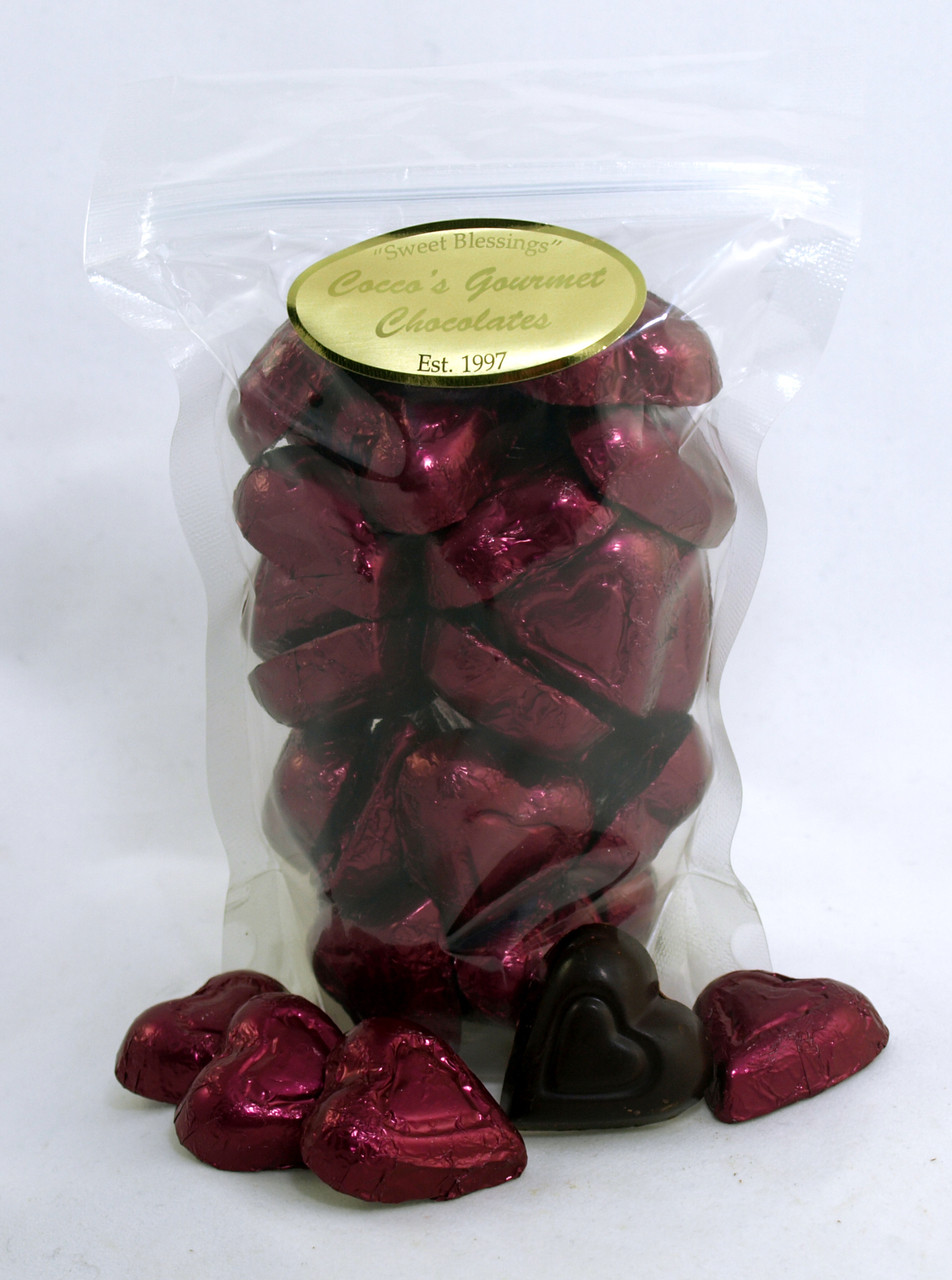 Our solid all natural premium dark chocolate shaped hearts have a 72% high cocoa content and are rich, creamy and flavorful! These mini hearts are individually wrapped in Cabernet colored Italian foils.They satisfy consumers growing need for the nutrition pure cocoa offers.They are the perfect treat for yourself! Bulk 8 oz. Ideas: "Treat Yourself", use in a candy dish, party platter or scatter across a set table. Customers say: " These are so rich and creamy!"Chocolate is made in the USA. Preservative Free.Kosher. Vegan.