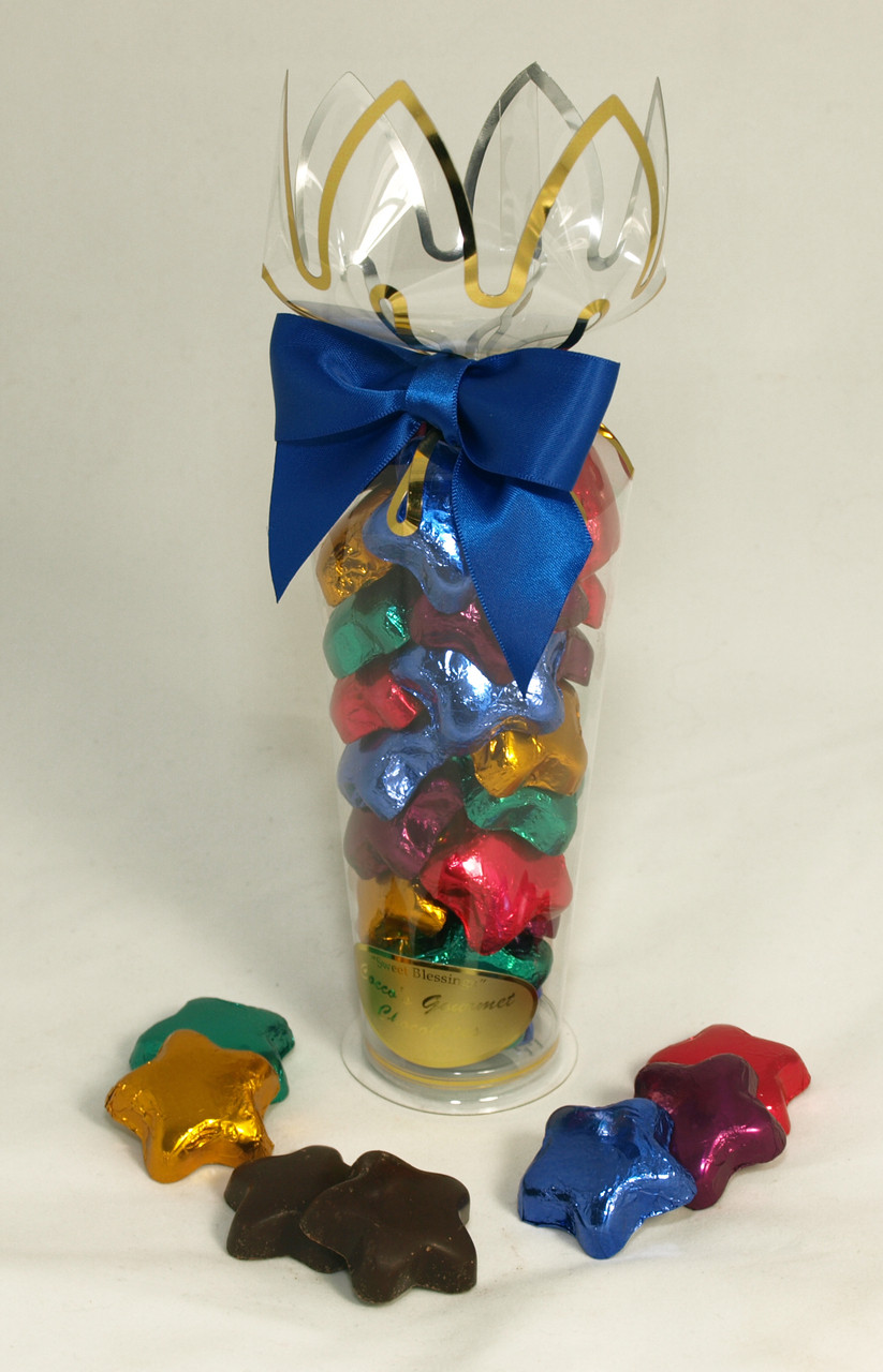 Our solid premium dark chocolate stars have a silken texture, rich flavor and a 53% cocoa content.They are wrapped in assorted jewel toned foils, imported from Italy and packagedin a large cornet. "The ultimate indulgence"!Weight 9 oz.Customers say, "They are not only delicious but majestic in appeareance"!Gift Idea: Passover, Chanukah, Birthday, Thank you, Hostess, Congratulations.Chocolate is made in the USA.Preservative free. Kosher.
