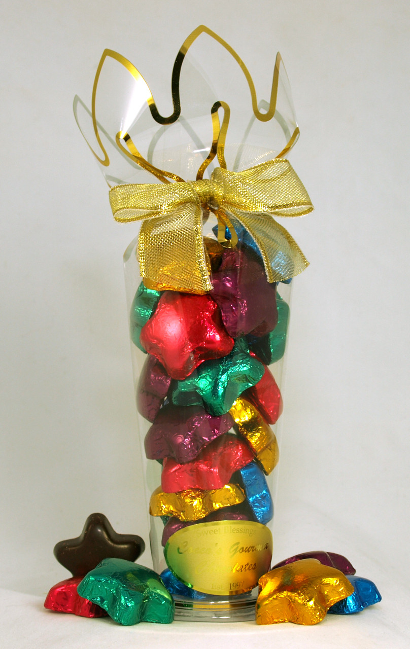 Our solid premium dark chocolate shaped stars, have a silken texture and rich flavor, with a 53% cocoa content.The chocolate is covered in assorted gem colored foils, imported from Italy and packaged in an elegant large cornet. The ultimate indulgence!Weight 9 oz.Customers say, "They are so colorful and make a beautiful gift"!Gift Idea: Holiday, Hostess, Thank you, Birthday, Congratulations, Tie to a balloon bouquet!Chocolate is made in the USA.Preservative free.Certified Kosher.