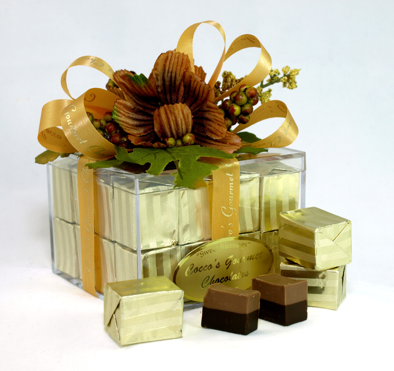 Our layered premium dark chocolate and milk chocolate truffles are so silky smooth in texture, with a flavor beyond compare! They are infused with pure hazelnut from Italy and are individually wrapped in two-tone gold Italian foil.Packaged in a crystal acrylic gift box, gold ribbon, hand made bow, and silk flowers they make an absolutely elegant gift for Fall. Absolutely delicious! Weight 14 oz. Quantity 32 Customers say, "These are my favorite. I buy one for me and one as a gift for every holiday"! "Absolutely decadent"!Gift Ideas: Autumn, Thanksgiving, Executive, Customer, Teacher, Birthday, Thank you, Hostess.Chocolate is made in the USA.Preservative free.Certified Kosher.
