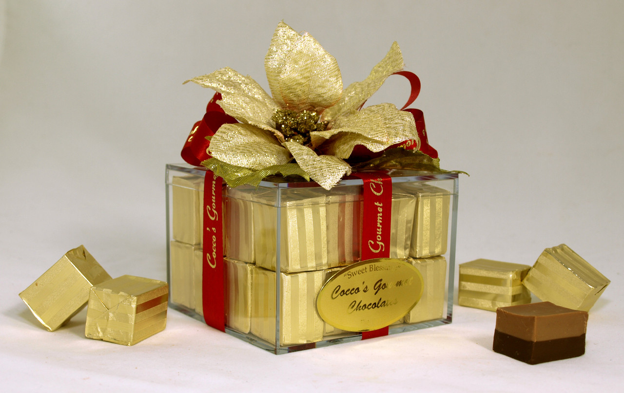 Our layered premium dark chocolate and milk chocolate truffles are so silky smooth in texture, with a flavor beyond compare! They are infused with pure hazelnut from Italy and are individually wrapped in two-tone gold Italian foil.Packaged in a crystal acrylic gift box, red ribbon and hand made bow with silk flowers. They make an absolutely beautiful holiday gift. Weight 12 oz. Quantity 32 Customers say, "These are my favorite. I buy one for me and one as a gift for every holiday"! "Absolutely decadent"!Gift Ideas: Christmas, Executive, Customer, Teacher, Birthday, Thank you, Hostess.Chocolate is made in the USA.Preservative free.Kosher.