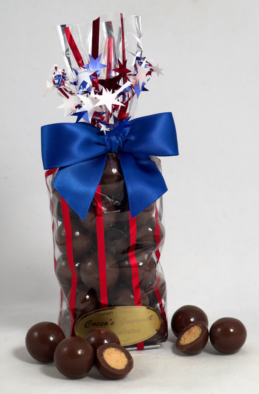 Milk Chocolate Malt Balls with a light and crunchy "Real Malt" center and then enrobed in our premium milk chocolate.....absolutely delicious!This yummy treat is packaged in a Patriotic Gift Bag and coordinating satin bow. They make the perfect treat! TOP SELLER! Weight 8 oz.Customers say, "These are the best tasting malt balls I have ever had!" "Out of this world"!Gift Ideas: Valentine's, Teacher, Employee, Coach, Hostess, Tie to a Balloon Bouquet, or "Treat Yourself"!Made in the USA.Preservative Free.Certified Kosher.