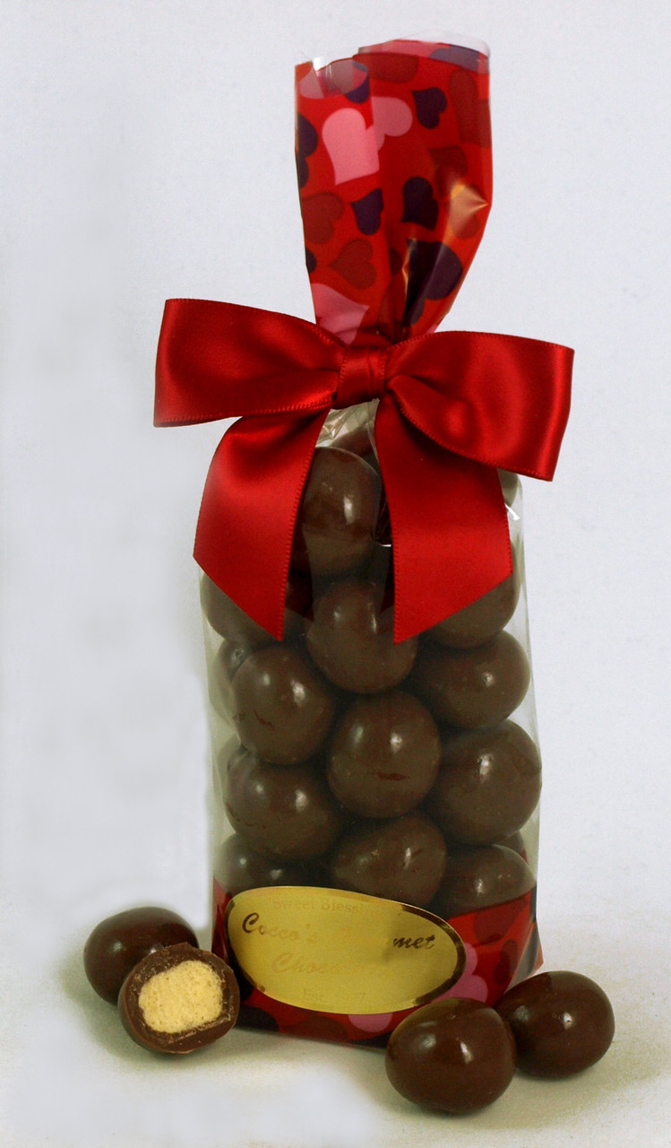 Milk Chocolate Malt Balls with a light and crunchy "Real Malt" center and then enrobed in our premium milk chocolate.....absolutely delicious!This yummy treat is packaged in a Valentine Gift Bag and coordinating satin bow. They make the perfect treat!Weight 8 oz.Customers say, "These are the best tasting malt balls I have ever had!" "Out of this world"!Gift Ideas: Valentine's, Teacher, Employee, Coach, Hostess, Tie to a Balloon Bouquet, or "Treat Yourself"!Made in the USA.Preservative Free.Certified Kosher.