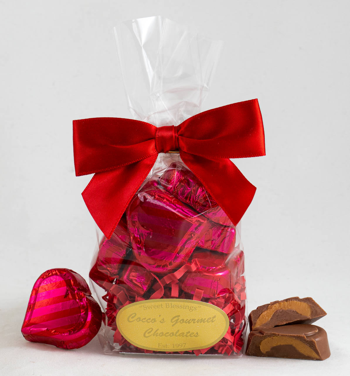 Premium creamy ,all natural milk chocolate hearts filled with a scrumptious peanut butter center and wrapped in bright purple stripe Italian foils. These are melt in your mouth delicious! If you like peanut butter, you will love these!These large size hearts are packaged in a French hard bottom bag and a coordinating purple satin bow.They make the perfect treat for this "Sweet" occasion! Hand Made.Qty. 8, Weight 4 oz., .5 oz. each Customer's Say: "These are absolutely delicious"!Gift Ideas: Valentine's Day, Romance,"Treat Yourself", Thank you, Teacher, Birthday, Tie to a Balloon Bouquet.Made in the USAPreservative FreeCertified Kosher