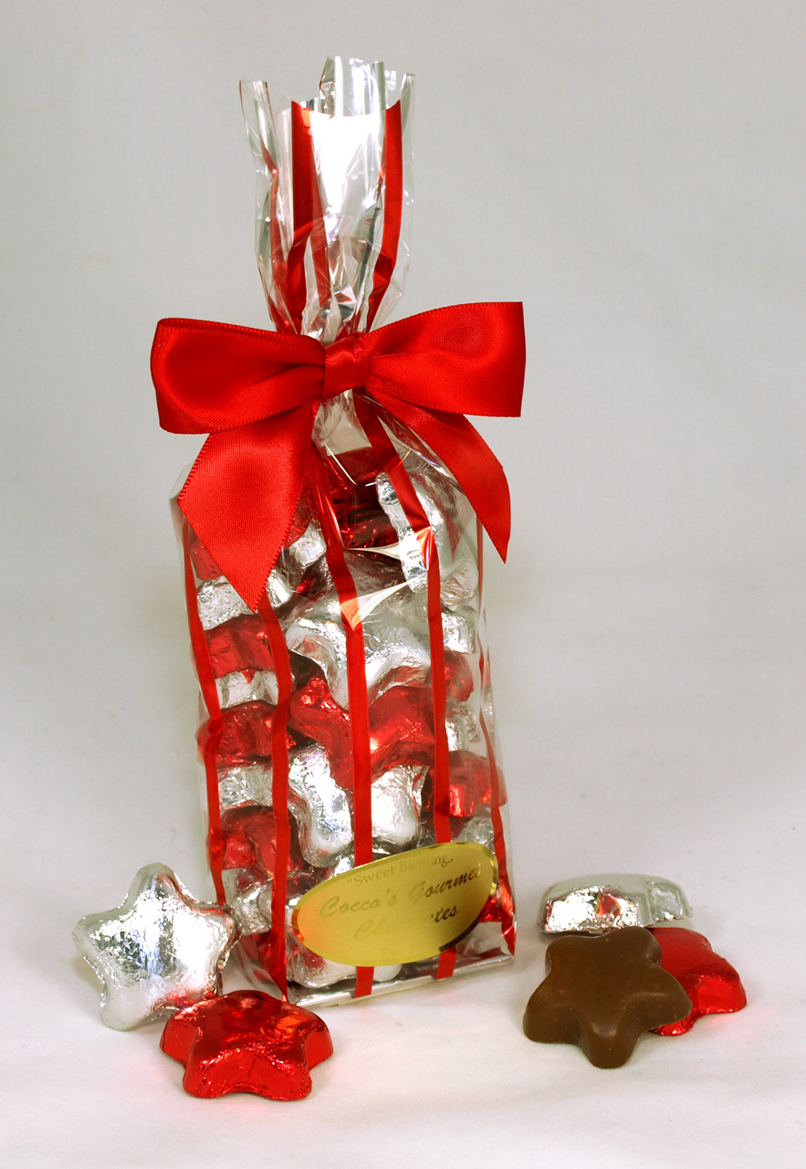 Our solid premium milk chocolate shaped stars have a silken texture and rich flavor, you'll just love!They are wrapped in colorful red and silver foils, imported from Italy and packaged in a festive red stripe hard bottom bag, imported from France with a red satin bow.Weight 8 oz.Customers say, " So tasty and delicious" and " Love the packaging"!Gift Ideas: Christmas, Birthday, Thank you, Teacher, Tie to a balloon bouquet, or "Treat Yourself"!Chocolate made in the USA.Preservative free.Certified kosher.